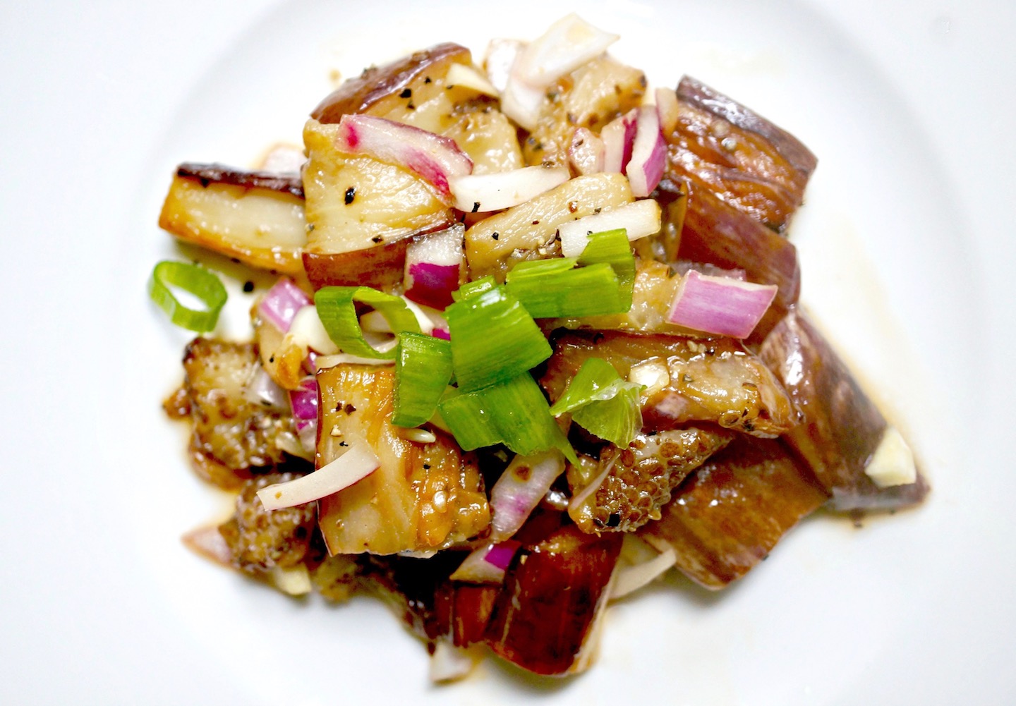 Sałatka z bakłażanem to doskonałe połączeni smaków – pikantnego czosnku, kwaśnego octu i cukru brązowego. Dressing tak skomponowany efektywnie podkreśla smak bakłażana.