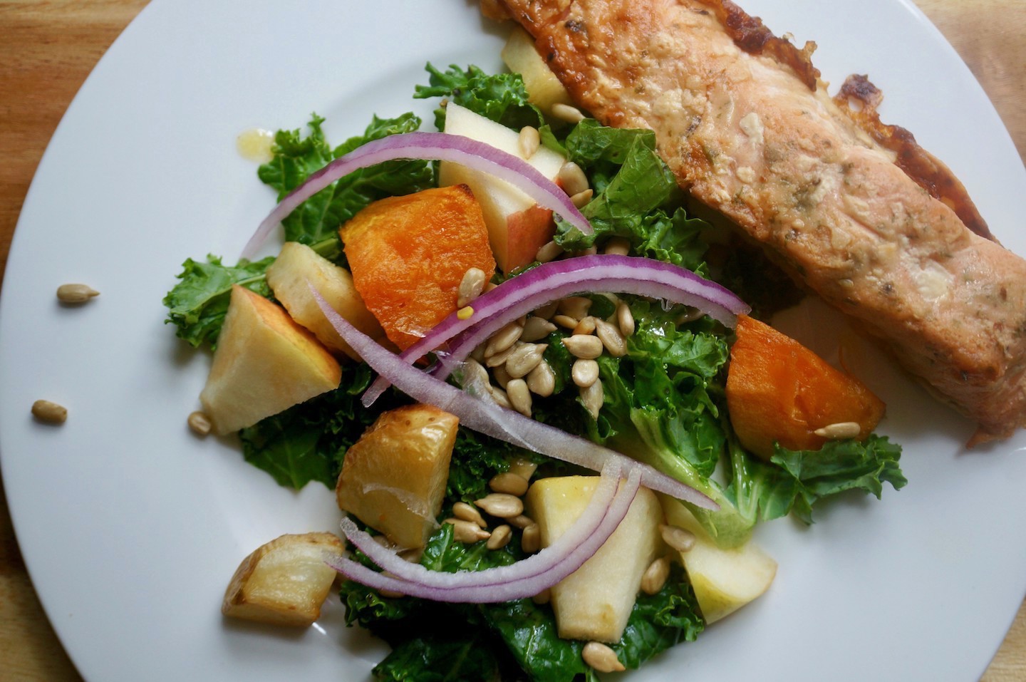 Sałatka z jarmużem, pieczonymi ziemniakami i łososiem jest pożywna. Jarmuż dostarcza witaminę K , prowitaminę A i chroniące oczy luteinę i zeaksantynę. Słodki ziemniak to pokaźne źródło prowitaminy A , a biały ziemniak to duża zawartość potasu. Nasiona słonecznikowe zawierają roślinne sterole które redukują zły cholesterol LDL.