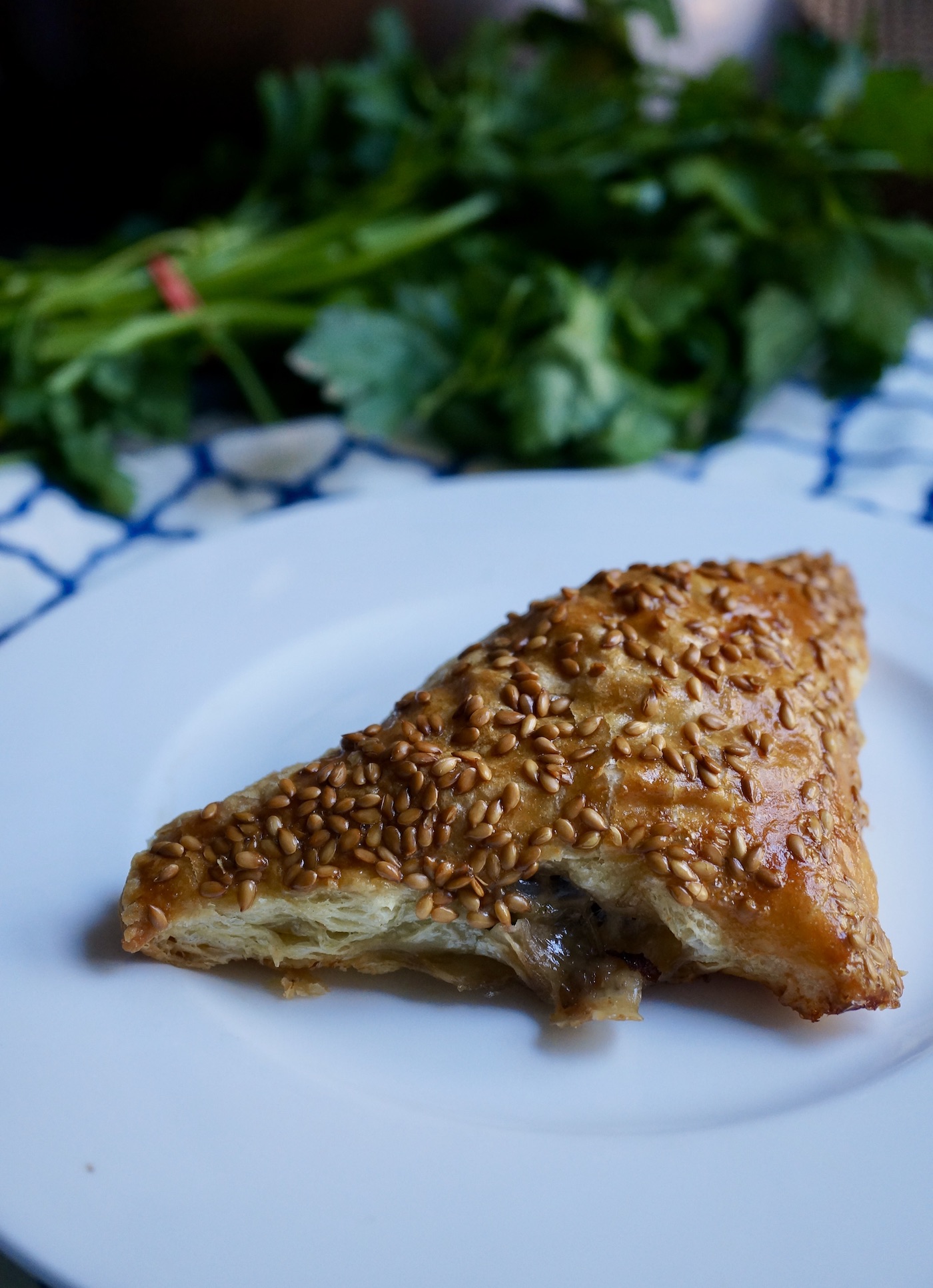 - Na kwadratowy kawałek ciasta francuskiego nakładamy farsz. Posypujemy startym serem parmezan. Składamy tak aby uzyskać trójkąt. Smarujemy jajkiem i posypujemy nasionami chia lub siemieniem lnianym. Pieczemy w piekarniku nagrzanym do do 190 stopni C przez 15-20 minut lub do czasu, aż się zarumienią.